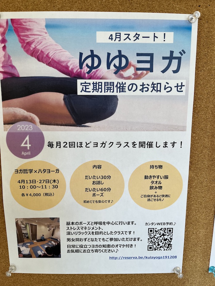 2023.04.12 / お知らせ 4月13日(木)はゆゆにてヨガ教室を行います。 講師の先生は佐々木先生です。ご参加はネットネット予約にてお待ちしています。ぜひご参加くださいね。 こちらよりアクセス可能です。 https://reserva.be/kulayoga191208